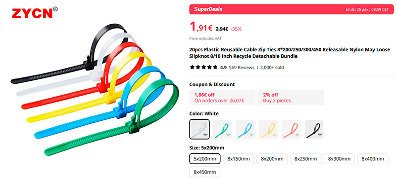 Пластиковые стяжки - всегда полезная штука для организации проводов. Еще полезнее, когда эти стяжки - не одноразовые а многоразовые, то есть если надо как-то по-другому все организовать, то просто раскрыть стяжки и установить заново как требуется. Разные цвета, несколько видов размеров от 150 до 450 мм.