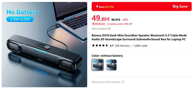Компактный саундбар Baseus DS10 для ПК и ноутбуков с двумя двухблочными драйверами и двумя низкочастотными драйверами. Размер 375х60х76 мм. RGB-подсветка корпуса, 3,5 мм и Type-C разъём. Подключается по Bluetooth 5.3 или по кабелю. Есть версия без встроенного аккумулятора и со встроенным аккумулятором.