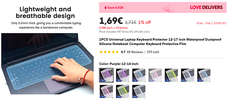 Для любителей во время работы с ноутбуком что-нибудь есть и пить - тонкая пленка (ссылка для РФ) для защиты клавиатуры от попадания жидкости и крошек. Подходит к ноутбукам с диагональю от 12 до 17 дюймов и выпускается в нескольких цветах. Пленка не мешает работе с клавиатурой.