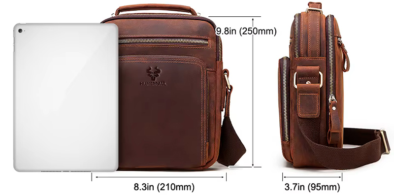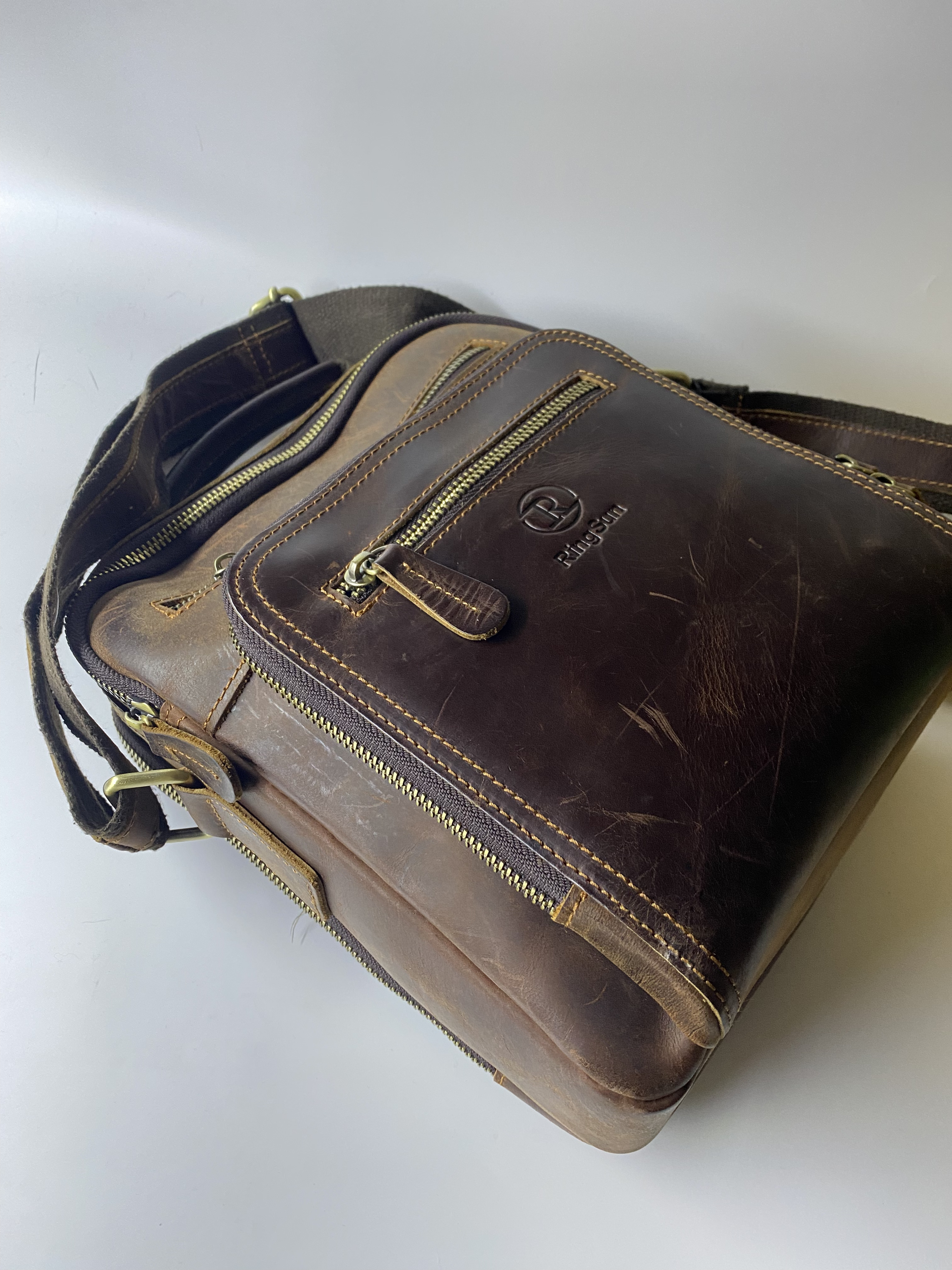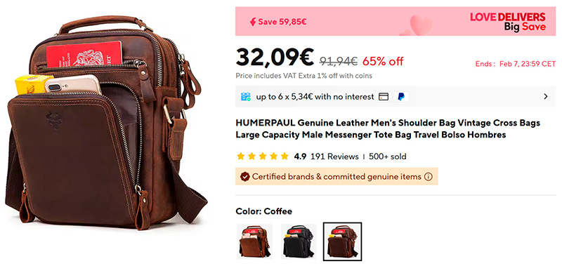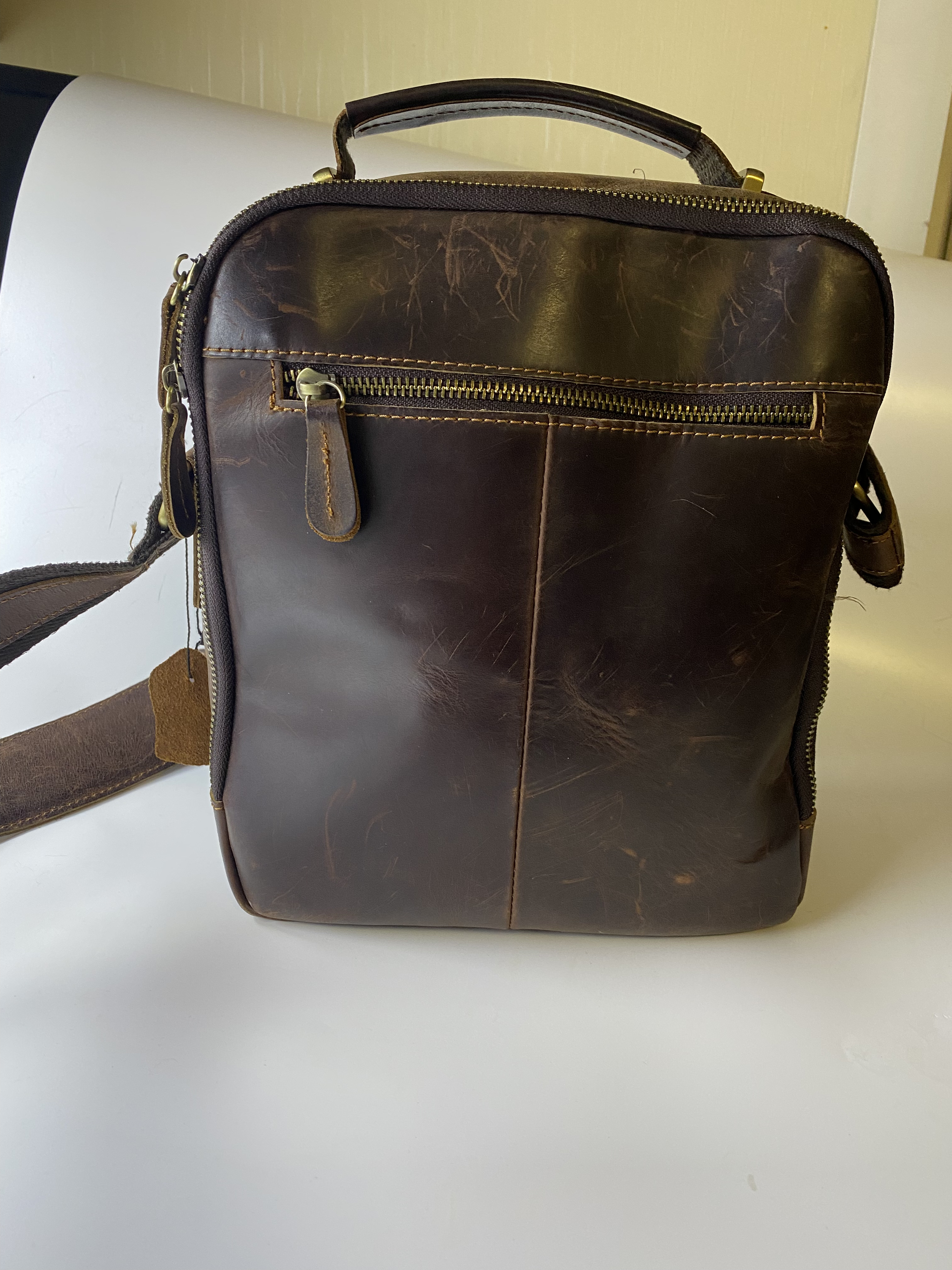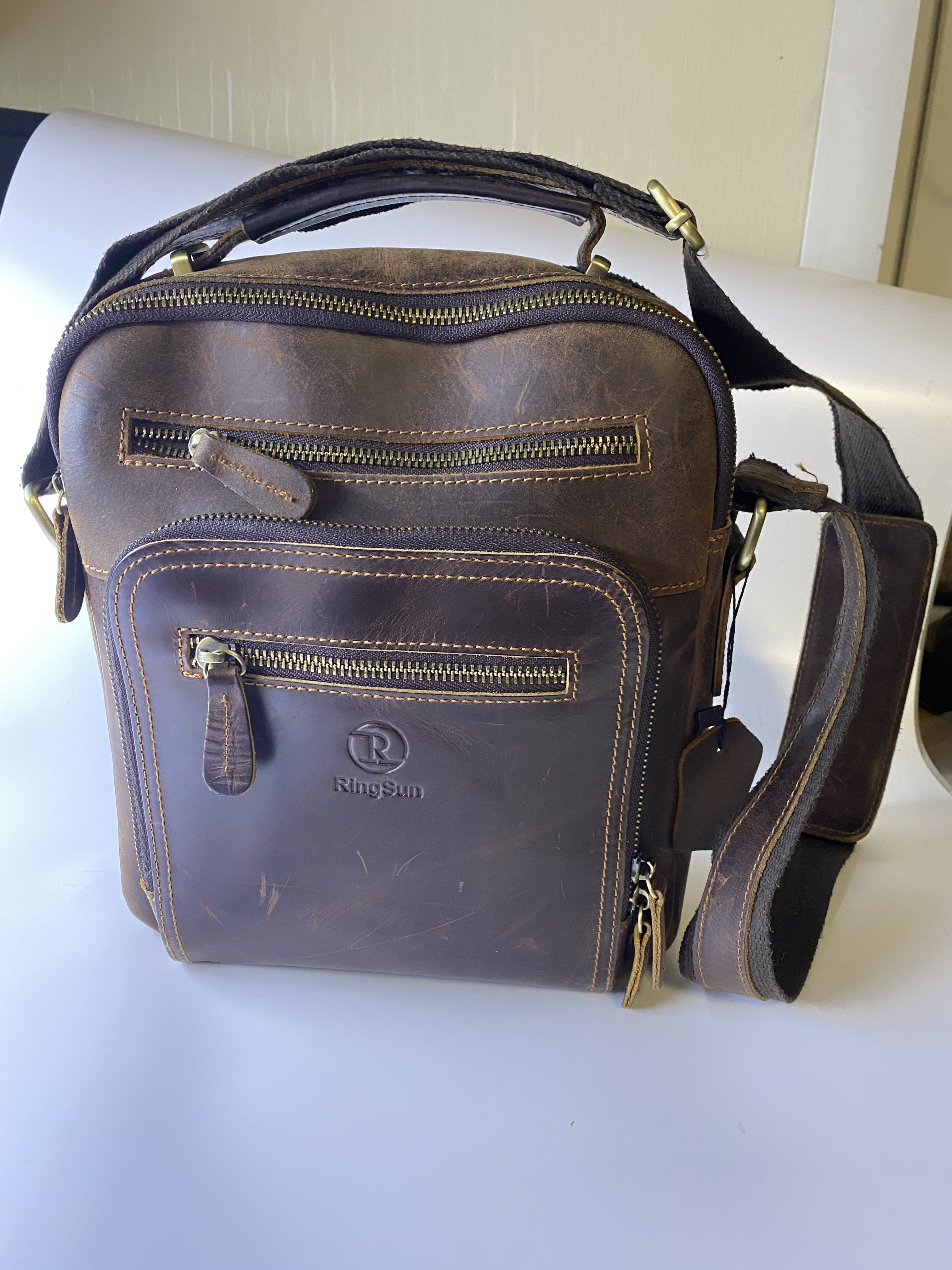 Вместительная (поместится 10-дюймовый айпэд) кожаная мужская сумка через плечо (ссылка для РФ) с несколькими отделениями на молниях и ручкой для переноски. Три цвета - коричневый, черный и, пардон, цвет Kaqi, как там написано. Я выбрал коричневый цвет. В наших краях такая кожаная сумка стоит под 200 евро, так что посмотрю, что эта собой представляет. В спецификации пишут, что натуральная воловья кожа.