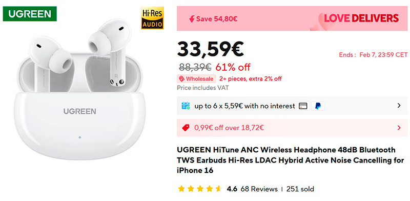 Одна из лучших недорогих альтернатив AirPods Pro - наушники UGREEN HiTune T6 (ссылка для РФ). Кодеки SBC и AAC,  Bluetooth 5.3, активное шумоподавление, 6 часов работы без подзарядки. Есть настройка через мобильное приложение.