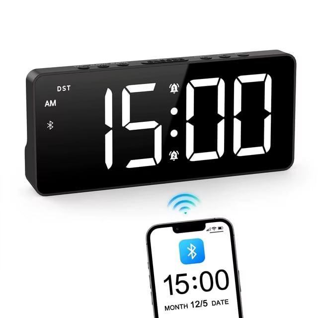 Элегантные часы-будильник ORIA с синхронизацией времени по Bluetooth. Большие чёткие цифры, 5 уровней яркости. Питание по шнуру USB Type C. На случай отключения электричества есть резервное питание от батареек, при котором экран автоматически гаснет через 10 с после активации по кнопке для экономии заряда.