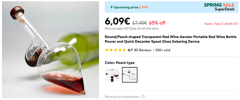 Очень прикольный дозатор и аэратор для вина (ссылка для РФ). Вставляете его в горлышко бутылки, сначала наливаете вино в каплевидный сосуд (там как раз получается порядка 100 миллилитров), затем из этого сосуда переливаете в бокал. Это итальянцы придумали, смотрится очень эффектно. Я не стал ждать, когда такая штука появится у китайцев - купил у итальянцев за €60 евро. Теперь дозатор есть на Aliexpress, и стоит на порядок дешевле.
