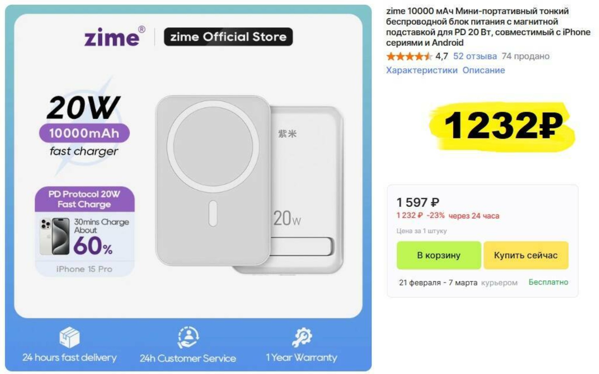 Ёмкость 10000 мАч, мощность 20 Вт, поддерживает быструю зарядку, лёгкий, тонкий и компактный, в комплекте кабель Type-C.