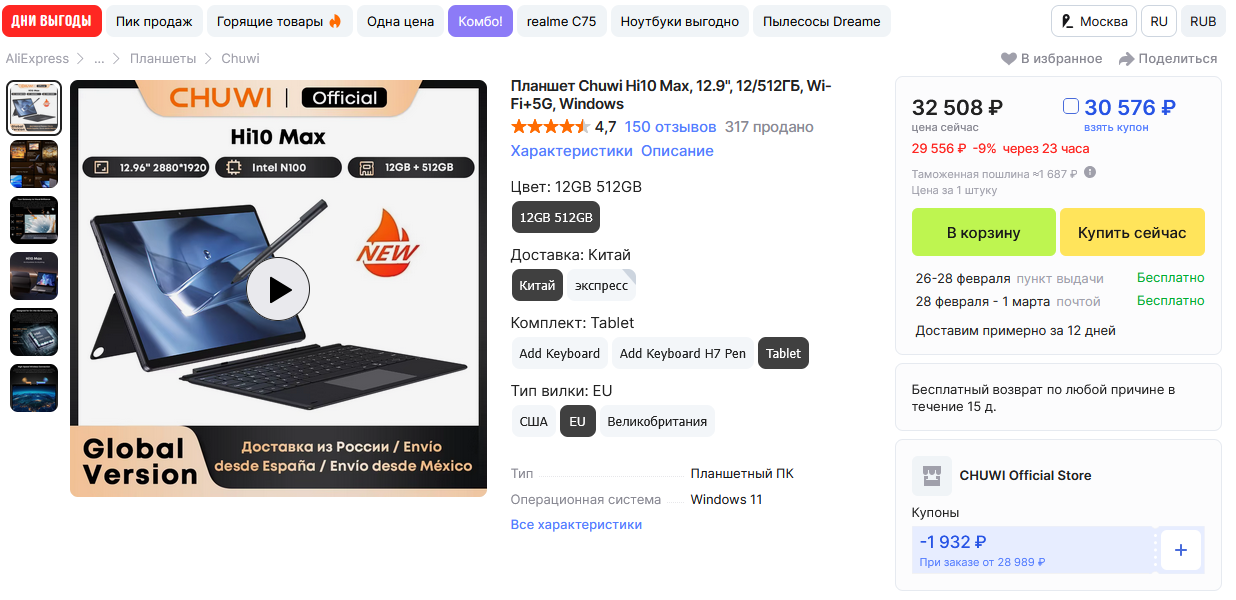 Нашел Chuwi Hi10 Max — 12,9-дюймовый планшет на Windows. Они участвуют в текущих распродажах, так что есть шанс купить со скидкой.