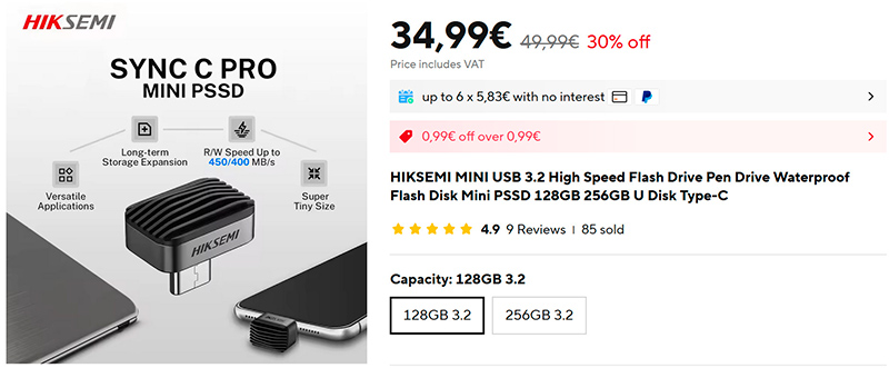 Очень маленький и при этом быстрый флеш-накопитель для порта Type-C (ссылка для РФ). Для ноутбуков, смартфонов и планшетов с OTG. Скорости до 450/400 MB/s. Емкостью 128 и 256 ГБ.