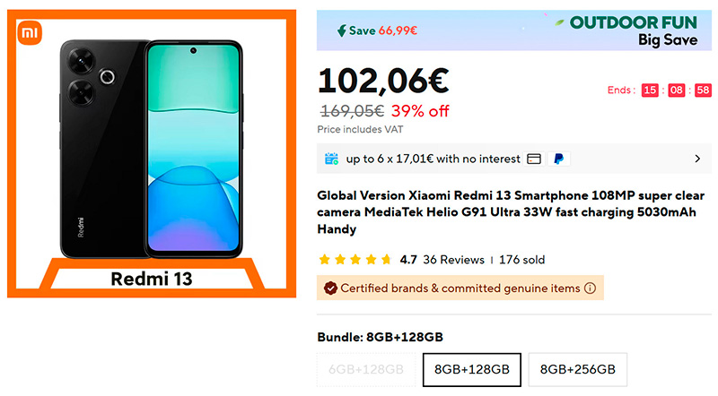 Для примера, один из таких вариантов - глобальная версия Xiaomi Redmi 13 (версия для РФ). Версия 8/256 ГБ стоит €128.