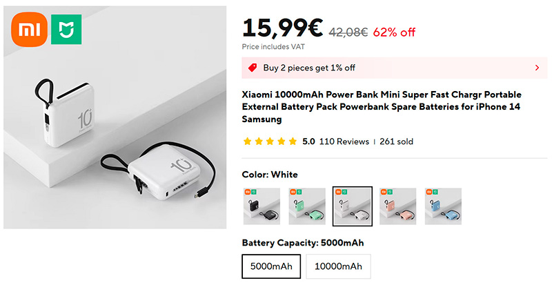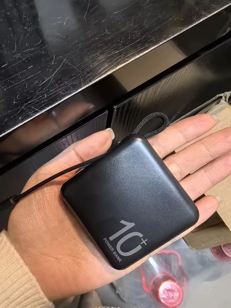 Еще один интересный вариант очень компактного внешнего аккумулятора (ссылка для РФ). Есть версия на 5000 мАч, есть версия на 10000 мАч (он, разумеется, больше). Быстрая зарядка, два встроенных вытягивающихся кабеля - Type-C и Lightning. Также есть петелька-ланьярд для удобства использования.