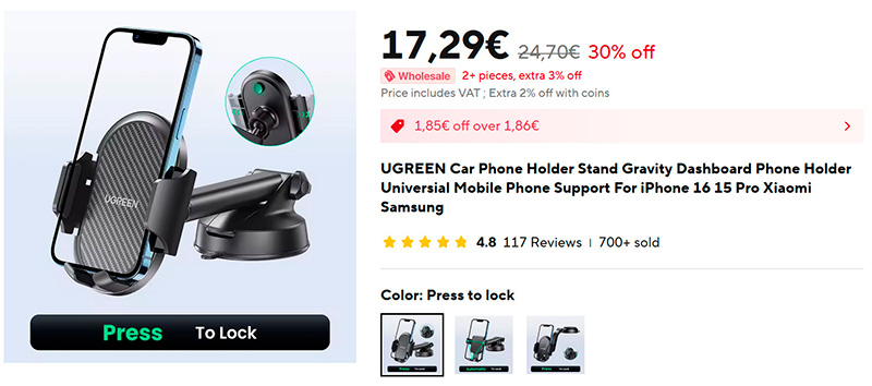 Удобный держатель для смартфона в машину от Ugreen (ссылка для РФ). Точнее, их там три вида, на выбор, один из них - с автоматической блокировкой смартфона в держателе.