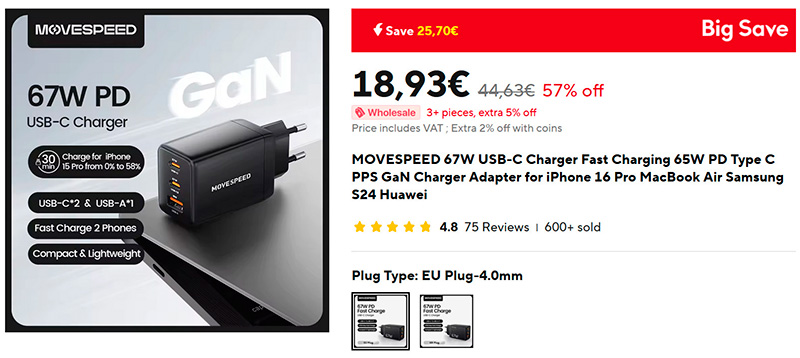 Недорогой GaN-адаптер от Movespeed на 67 Вт (ссылка для РФ). Компактный и удобный, два порта Type-C на 67 Вт и порт USB-A на 18 Вт.