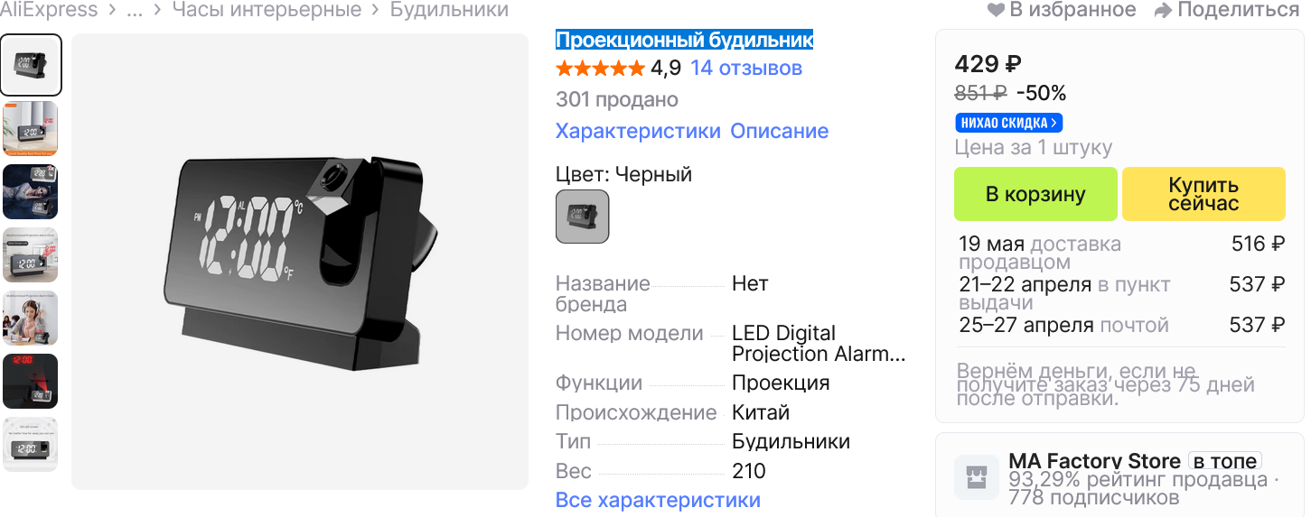 Странно, у меня все ок. Как исправить ситуацию?? Поищи по названию "Проекционные часы с термометром Oregon Scientific RM338PX" или вот артикул 202834669. Кстати, при поиске по названию и на Wildberries их навалом. Вот, например. Еще один важный момент! Часы работают от двух батареек ААА и в этом режиме показывают проекцию, только если кнопку нажать, поэтому я подкупил еще адаптер питания универсальный 5.0 V, 0.5A (3,5x13 мм) и, поключенные к электросети часы, уже светят в потолок постоянно. А батарейки стоят на борту и в случае перебоев с электричеством, питают часы. В общем, часы уже два месяца у меня и очень нравятся, рекомендую!