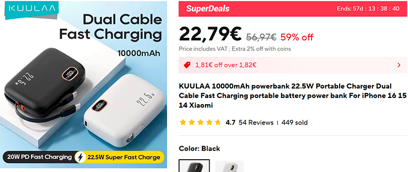 Компактный внешний аккумулятор KUULAA на 10000 мАч (ссылка для РФ) с мощностью зарядки 22,5 Вт. Очень компактный, есть дисплей с уровнем заряда, есть два встроенных кабеля - Type-C и Lightning.