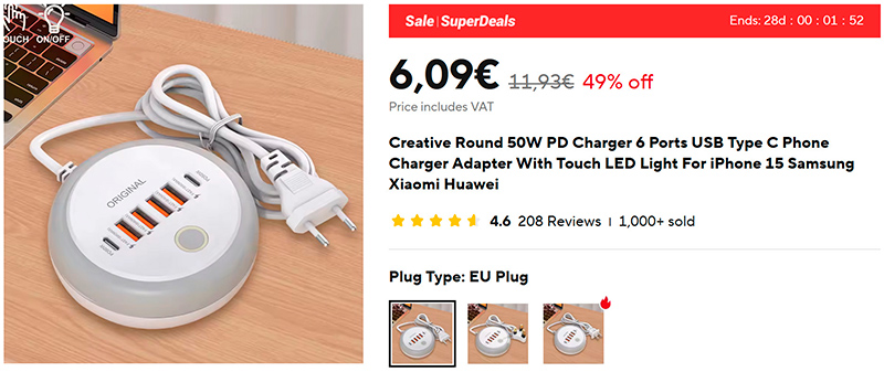за 200₽ на AliExpress с платной доставкой. Оснащён штекерами USB Type-С и Lightning, поддерживает быструю зарядку 65 Вт.
