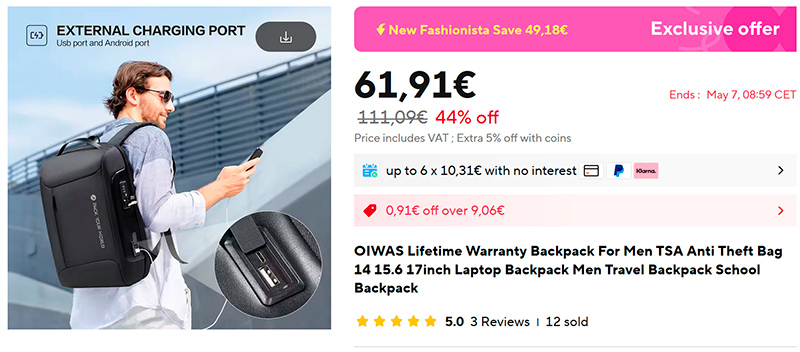 Защищенный от воров рюкзак OIWAS (ссылка для РФ) размером 30х13х46 см, вмещает ноутбук до 17", сделан из прочного влагозащищенного нейлона, имеет встроенные порты и кодовый замок TSA.