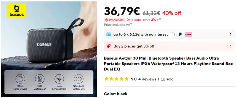 Портативная Bluetooth-колонка Baseus AeQur 30 (ссылка для РФ). Очень компактная, размер 80х112 мм, драйвер 40 мм, защита IPX6, два режима воспроизведения. До 12 часов на одном заряде.