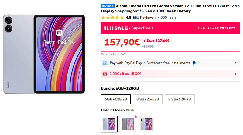 Цена на 12-дюймовый планшет Redmi Pad Pro упала до 158 евро. А планшет - отличный, я делал его обзор, и именно им сейчас сам и пользуюсь. Версия с памятью 8/256 ГБ стоит там €186.
