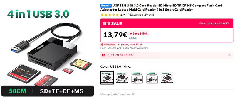 Несколько видов универсальных кардридеров UGREEN. Такой как на картинке - я сам использую. Это очень удобно: когда не нужен, кардридер лежит в ящике стола, а когда нужно считать что-то с карты - достается и подключается. И там еще есть вариант кардридера, совмещенного с двумя портами USB 3.0.