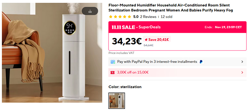 Напольный увлажнитель воздуха с дисплеем. Работает практически бесшумно, оснащен крупным резервуаром на 8 литров, что позволяет ему работать в течение 24-48 часов, и может распылять прохладный туман, поднимая влажность воздуха в помещении. Легко интегрируется в интерьер и не занимает место на тумбочке или на столе. Уровень увлажнения регулируется, равномерное распределение влажности. Стоит он в районе 60 евро, там часть цены включена в оплату доставки.