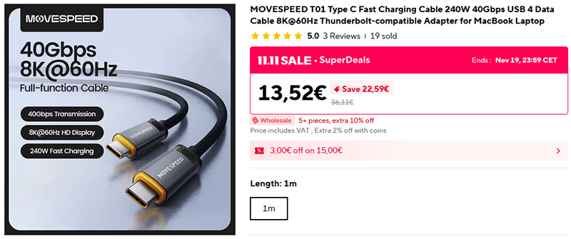 Компания Movespeed выпустила высококачественный и высокоскоростной кабель Type-C - Type-C, поддерживающий мощность до 240 Вт, скорость передачи до 40 Гбит/с, вывод медиа формата 8K@60Гц.