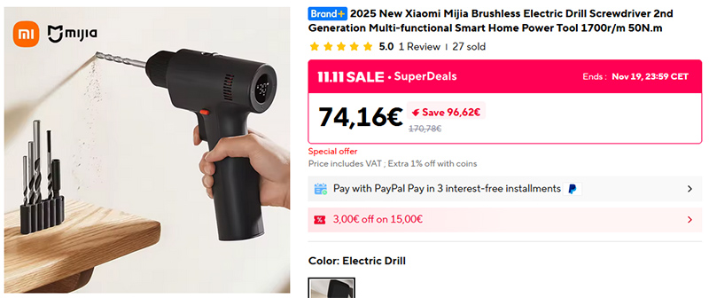Новая бесщеточная электрическая дрель-шуруповерт Xiaomi Mijia 2-го поколения: 1700 об/мин, аккумулятор емкостью 1900 мАч, дисплей, два вида скоростей вращения. В комплект входят сверла и биты.