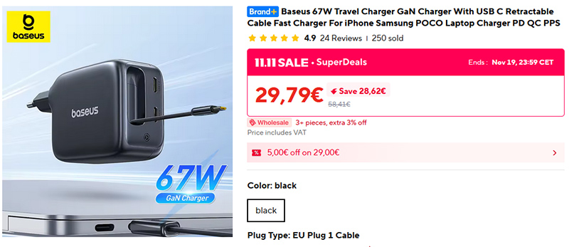 GaN-адаптер Baseus мощностью 67 Вт с поддержкой Power Delivery (подходит для питания ноутбуков) и QC, с вытягиваемым 80-сантиметровым кабелем и двумя портами Type-C, поддерживающих максимальную мощность зарядки.