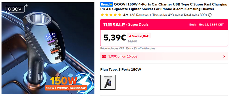 Интересный автомобильный зарядный адаптер QOOVI: мощность аж 150 Вт, переходник на гнездо прикуривателя, три зарядных порта - 2x USB-A и Type-C, - дисплей, показывающий параметры зарядки.