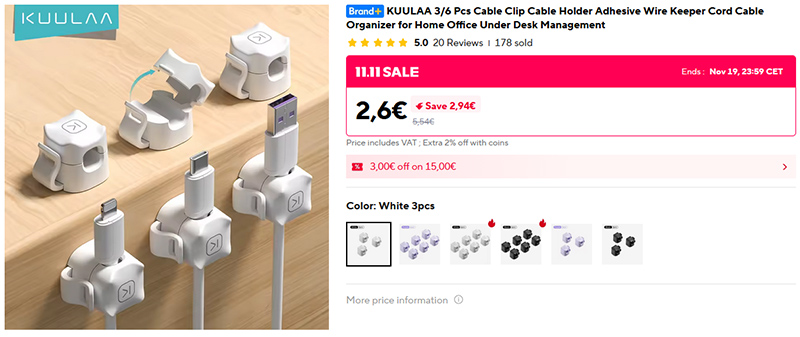 Наборы магнитных органайзеров для кабелей KUULAA. Разные виды цветов, разные комплектации. На мой взгляд, это одни из самых удобных органайзеров: их можно закреплять на торцевой части стола, кабели из них легко вытягиваются и не занимают место на столе. К столу органайзеры прикрепляются на двухсторонний скотч.
