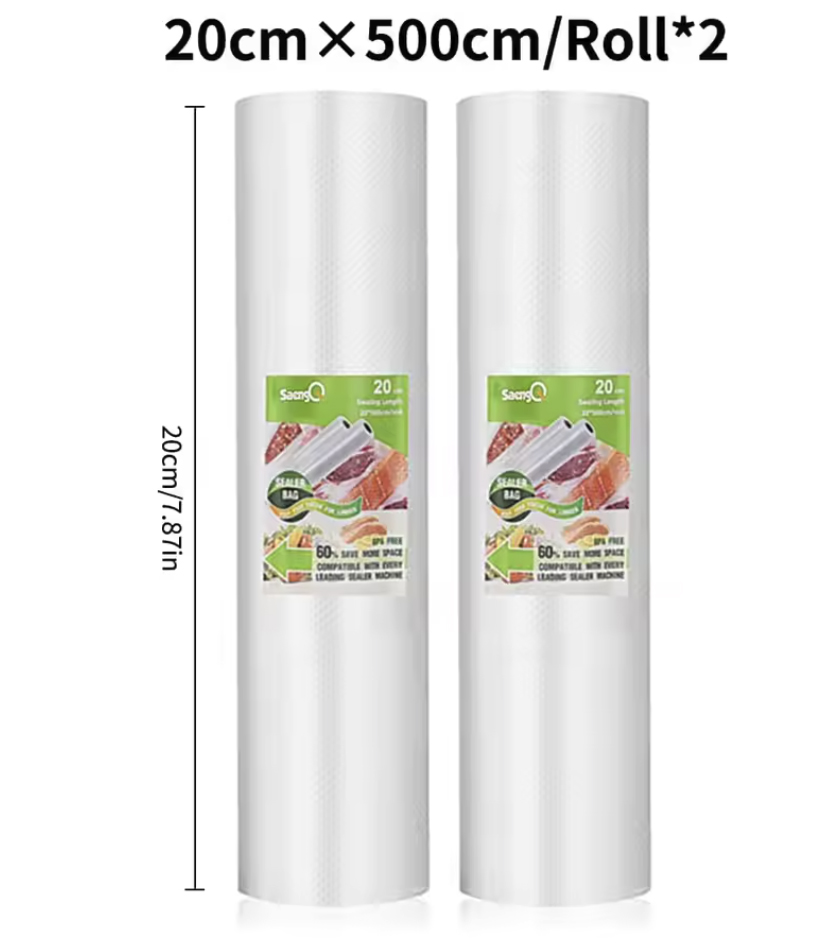 2 рулона пакетов для вакууматора самых ходовых размеров- шириной 12, 15, 20, 25 и 30 см. Длина рулона 5 метров.