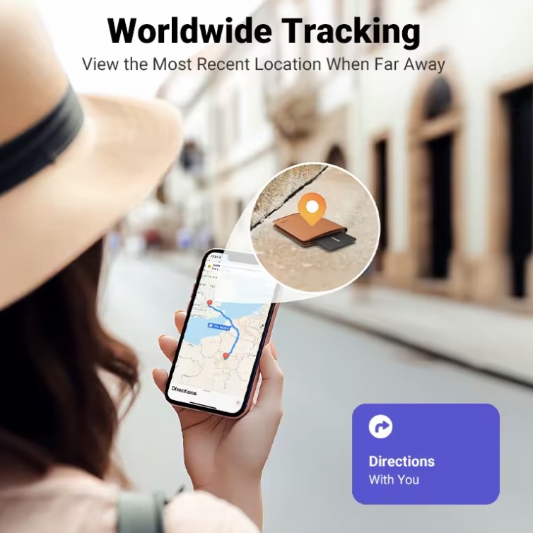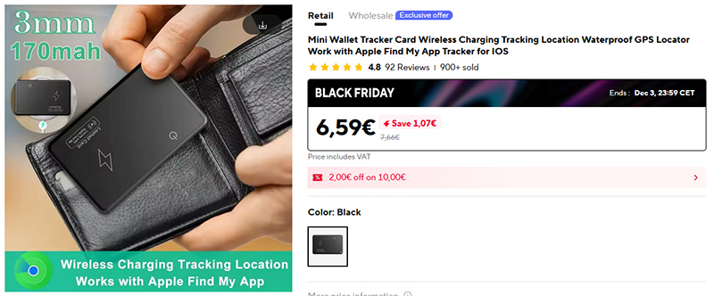 Трекер типа AirTag, работающий с приложением "Локатор" от Apple, в формате банковской карты. AirTag не очень удобно засовывать в кошелек, а трекер такого формата - вполне удобно. Есть аналогичный от UGREEN, сертифицированный Apple, но он что-то уж больно дорогой - аж 25 евро.