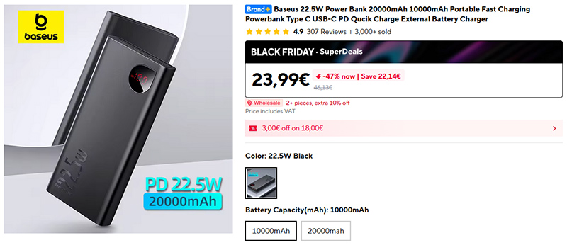 Аккумуляторы Baseus на 10000 и 20000 мАч. Поддержка PD 22,5 Вт, поддержка быстрых протоколов зарядки PD3.0, QC3.0, FCP, AFC, MTK и так далее. Есть дисплей, показывающий уровень заряда, два выходных порта USB-A, один порт вход/выход Type-C. Поддерживает зарядку макбуков PD 18W Emergency Quick Charge.