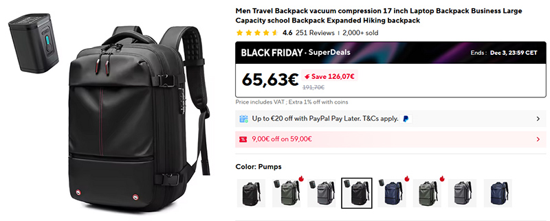 Вместительный рюкзак от Tigernu: в его крупный основной отсек можно уложить вещи, после чего из отсека выкачивается воздух через специальный разъём с помощью комплектной помпы, уменьшив габариты рюкзака в полтора-два раза! При необходимости объём увеличивается за счет вставки-гармошки. Есть различные дополнительные отсеки - для ноутбука, ключей и так далее, есть кодовый замок. Без помпы и дополнительной вставки объем 25 литров, с расширением и помпой полезный объем можно увеличить до 60 литров.