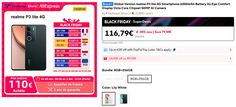 Компания Realme выпустила новую бюджетную модель Realme P3 lite. За 116 евро - платформа Unisoc T7250 (300000 в AnTuTu); дисплей 6,67" HD+ 120Hz, 725 нит; памяти 8/256 ГБ, камера 50 Мпикс, аккумулятор 6000 мАч.