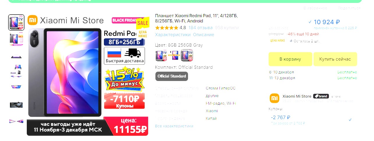 Дисплей 11" с разрешением 2560x1600, ОС Xiaomi HyperOS 2, процессор MediaTek Helio G100-Ultra, аккумулятор на 9000 мАч, Bluetooth, Wi-Fi, 4 динамика, основная камера на 8 МП. Отличная цена за такие характеристики.