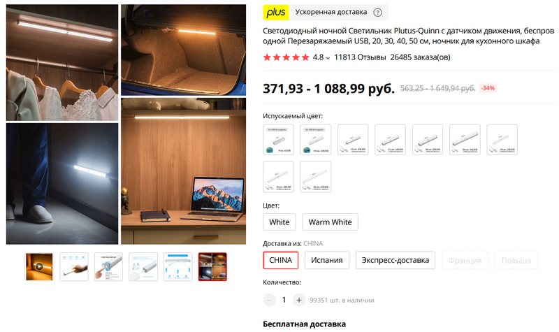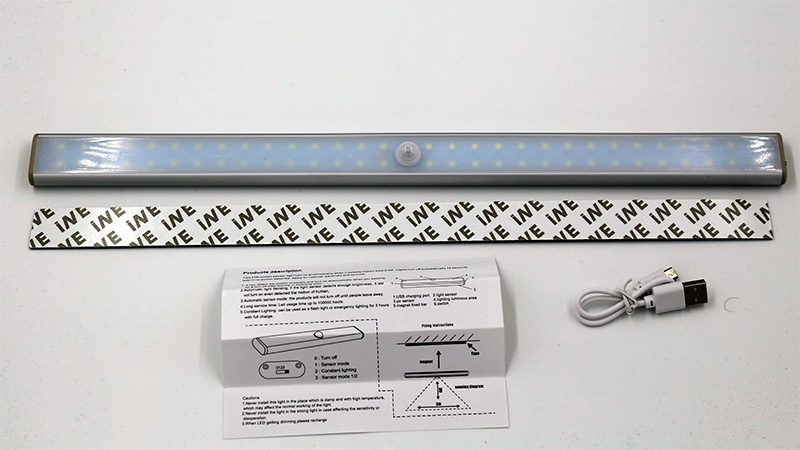 В комментариях к одному из прошлых выпусков порекомендовали светильники другого типа - вот такие. Они разных размеров - от 9 до 40 сантиметров, - содержат от 6 до 60 LED-светильников, заряжаются через порт microUSB, имеют магнитный держатель, который двухсторонней лентой прикрепляется к поверхности, определяют движение на расстоянии до 3 метров в пределах угла в 120 градусов, имеют три режима срабатывания (переключаются рычажком с торца), также можно выбрать цветовую температуру - холодную или теплую.