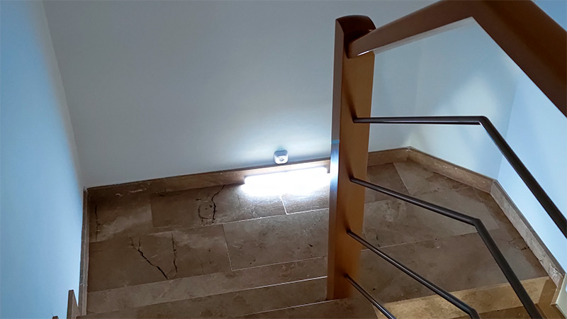 Ну и вот он на лестнице под старым светильником (я новый пока не прикреплял, проверял, как он работает, чтобы понять, куда именно прикреплять). Срабатывает отлично, действительно метров с трех, размещенный строго посередине срабатывает и при движении по верхней и нижней лестнице, достаточно яркий (одного светильника вполне хватает на весь лестничный пролет) - в общем, очень доволен и уже заказал еще несколько.
