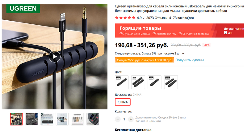 Удобный органайзер для кабелей от Ugreen. Может клеиться на стол, на торец стола - как угодно. Понравился больше, чем те, которые я сейчас использую, заказал.