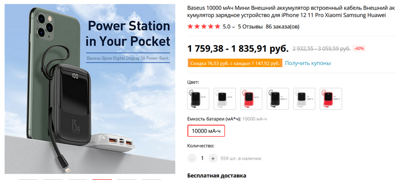 Внешние аккумуляторы неизменно пользуются популярностью. Интересная модель аккумулятора от Baseus: 10000 мАч, очень компактный, с петлей для руки и со встроенным кабелем (для айфона или для смартфона с Type-C).