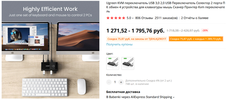 4-портовый KVM-переключатель для попеременной работы с двух компьютеров (например, ПК и ноутбука) с одной клавиатурой, мышью, внешними дисками, флешками, принтерами, сканерами и так далее. Есть под USB 2.0 и под USB 3.0.