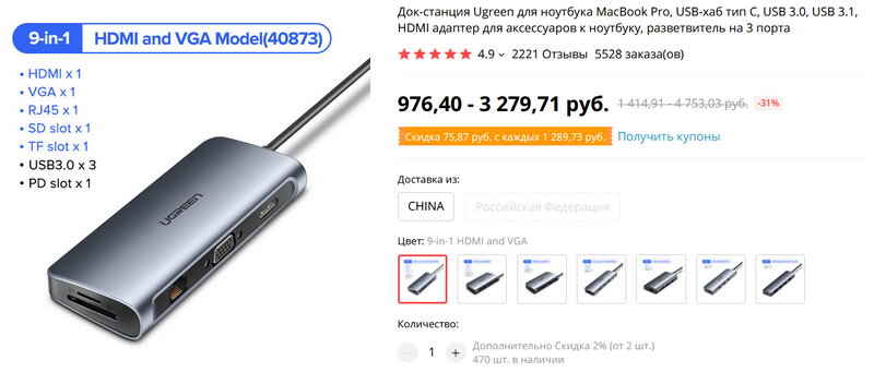 Целый набор док-станций для ноутбуков с Type-C. От девяти в одном до пяти в одном различных конфигураций. Я себе 9-в-1 заказал для ноутбука - пригодится в разъездах. Там все, что только можно придумать!