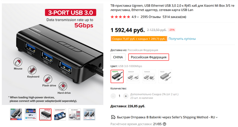 Еще один вариант переходника с USB на RJ-45 - он подороже, но одновременно является и USB-хабом, что очень даже нелишнее. Подходит и для ноутбуков, где вечно не хватает портов USB, и просто идеальный вариант для компактных медиаплееров, вроде Xiaomi Mi Box S, где нет выхода Ethernet и где нужны свободные USB-порты.