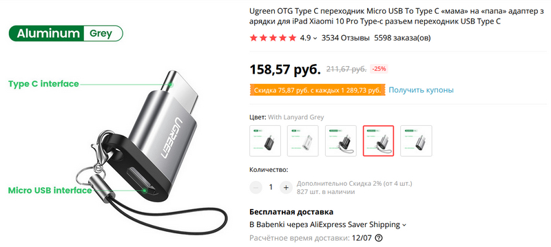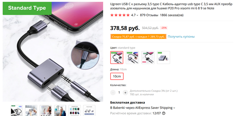Несколько видов переходников от UGREEN с Type-C на аудиоджек и Type-C (то есть чтобы можно было и музыку слушать, и смартфон одновременно заряжать). С проводом, без провода, металлический, из пластика. У меня похожие есть, но взял парочку разных - пригодятся.