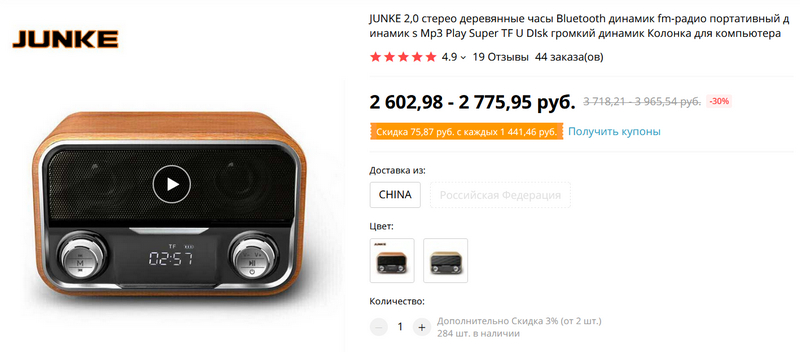 "Беспроводная колонка с винтажным дизайном в деревянном корпусе. " У китайцев понятие деревянный корпус специфическое. Обычно это уплотнённый картон, обклеенный пленкой (ЛДСП, вроде бы это называется). Как бы ничего плохого в этом нет ("деревянные" дешёвые колонки так и делают.) Но по факту наличие обмана, т.к. на Али есть часы, действительно из дерева.