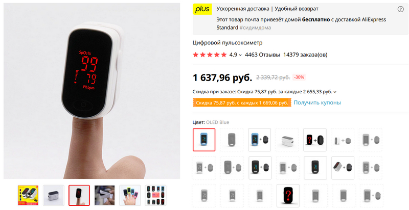 Очень актуальное нынче устройство - цифровой пульсоксимер. Основное его предназначение - контроль количества кислорода, содержащегося в организме человека. Особенно важное значение эти измерения приобретают в условиях вирусных эпидемий, приводящим к различным респираторным заболеваниям: в этом случае контроль количества кислорода может помочь выявить заболевание на ранней стадии. Ну и пульс, конечно, тоже измеряет.