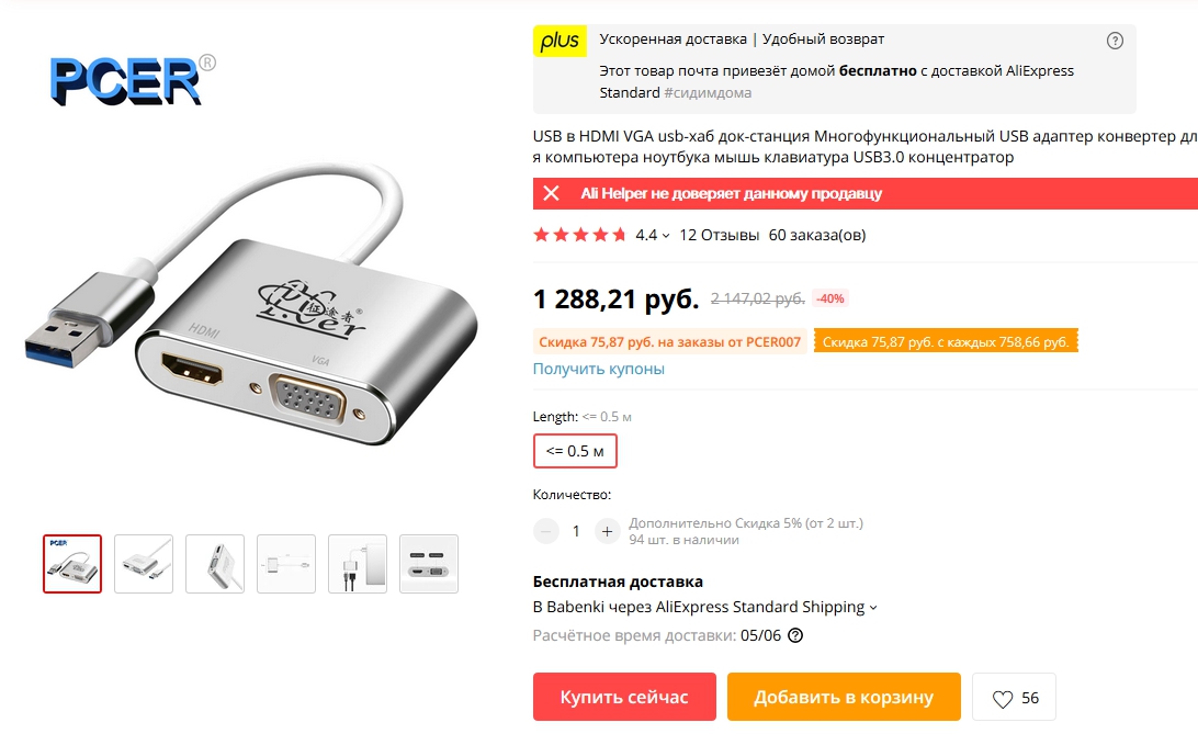 - Я покупал вот такой адаптер USB3.0 на VGA. Работает, но только USB3.0 порт всегда им занят, что не айс. USB3.0 разветвитель есть, но тогда переходник не работает. Уперся в это ограничение.