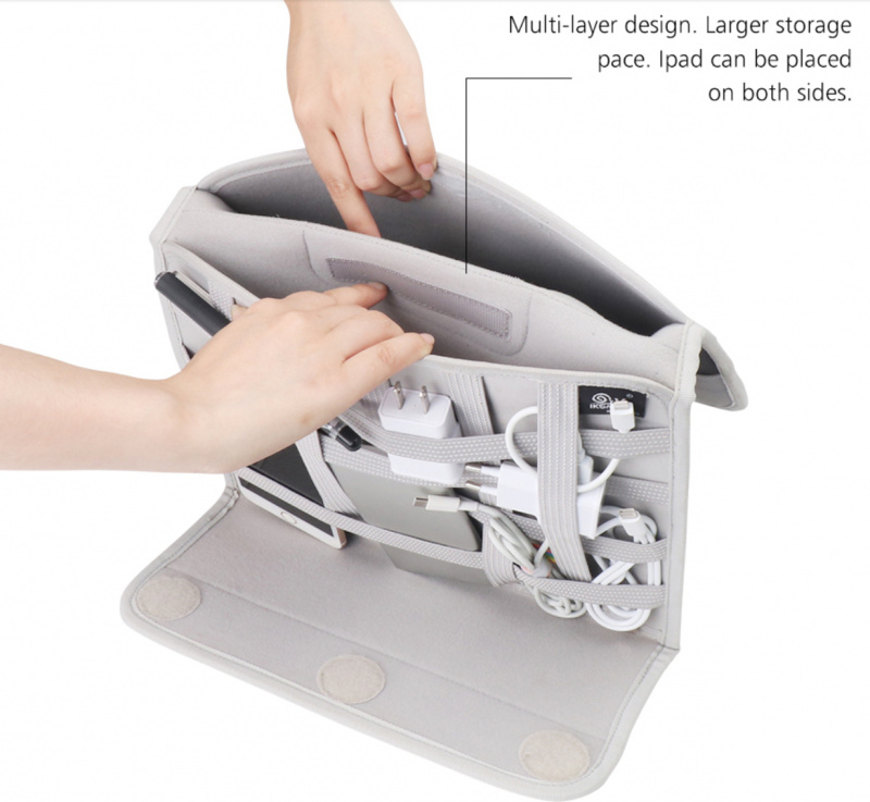 Папка-органайзер с несколькими отделениями для переноски планшета, переходников, аккумуляторов, карт памяти, флешек и так далее. Есть двух размеров.