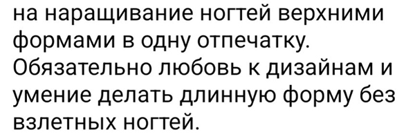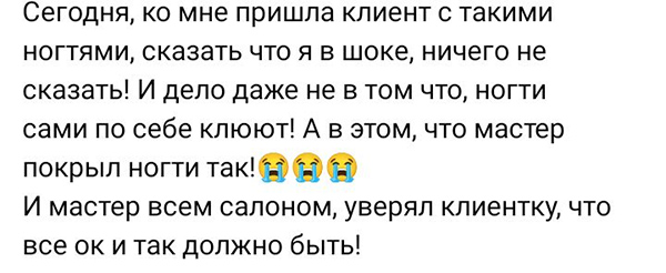 А то, понимаешь, понабирают по объявлениям, после чего ногти сами по себе клюют. И мастер всем салоном уверяет клиентку!