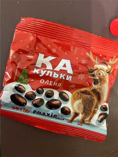 Это не белорусские кондитеры придумали, а украинские. Я знаю и белорусский, и украинский. Слово "кульки" (шарики) есть только в украинском, в белорусском "шарыкі". И дальше надпись "арахіс" — тоже на украинском. По-белорусски тоже "арахіс", но по-белорусски было бы "аленя", а тут по-украински "оленя". Нашел эти драже в украинской сети Аврора: avrora.ua