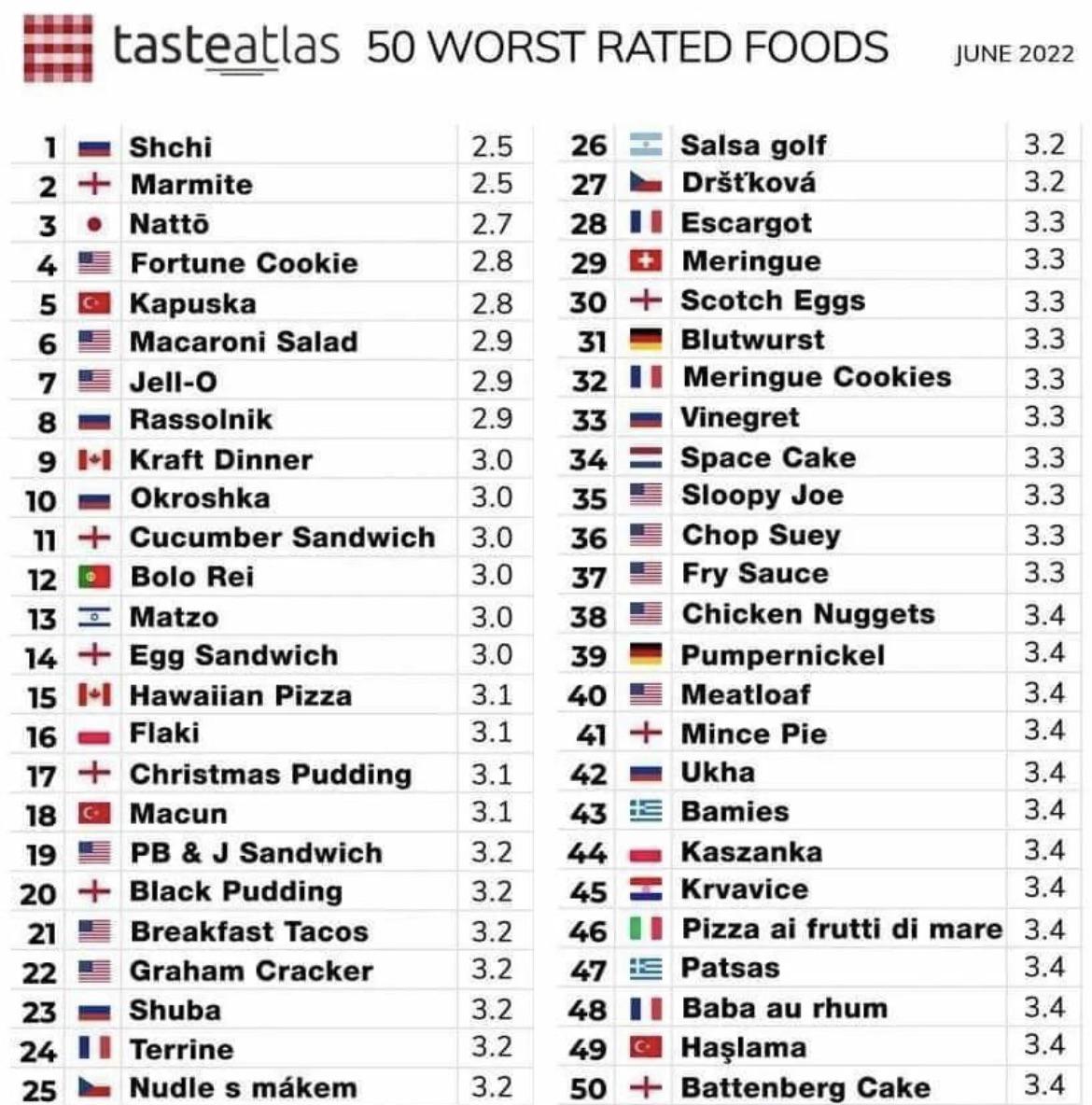 На сайте Tasteatlas подробная подборка из 100 худших по рейтингу продуктов (блюд) в мире.