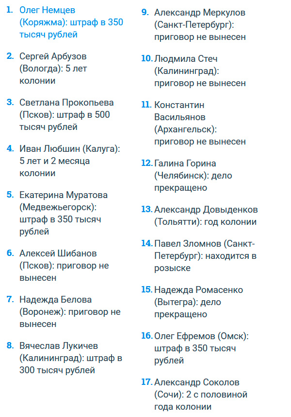 Так вот. Оказывается, по поводу этого дела было еще как минимум 17 уголовных дел. С реальными сроками. Кого судили? Людей, которые просто высказывали свое мнение по поводу данной истории в соцсетях.