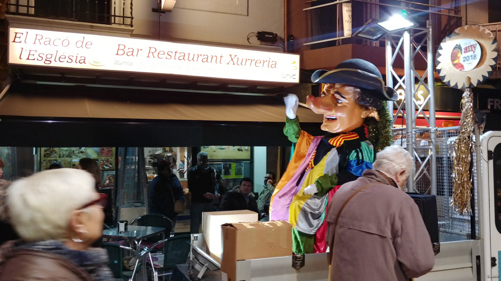 Начинается традиционная процессия - мужик с большим носом едет в повозке и разбрасывает всем носы на резиночке. Его сопровождают маски.